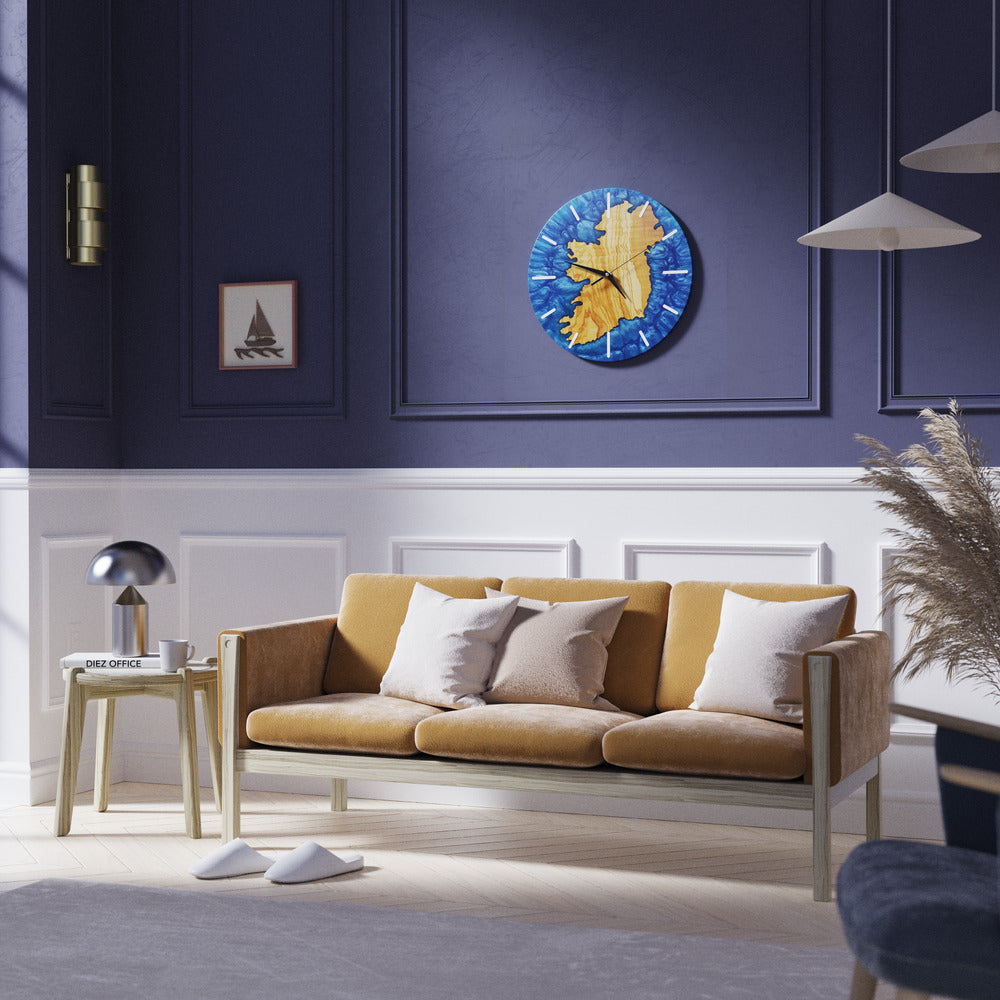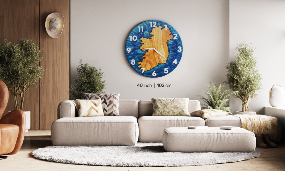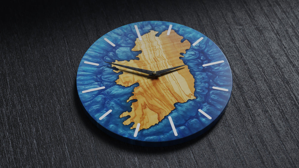 Introducing the Éire Resin Wall Clock – a mesmerizing fusion of art and functionality, uniquely crafted to celebrate the beauty of Ireland. This exquisite timepiece showcases the map of Ireland, capturing the essence of the Emerald Isle and adding a touch of personalized charm to your living spaces. As a custom-made wall clock, the Éire Resin Wall Clock sets the stage for your imagination, offering a wide array of possibilities for creating a truly unique and meaningful timepiece.