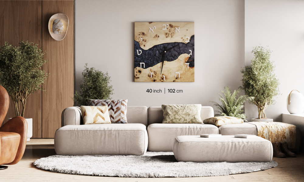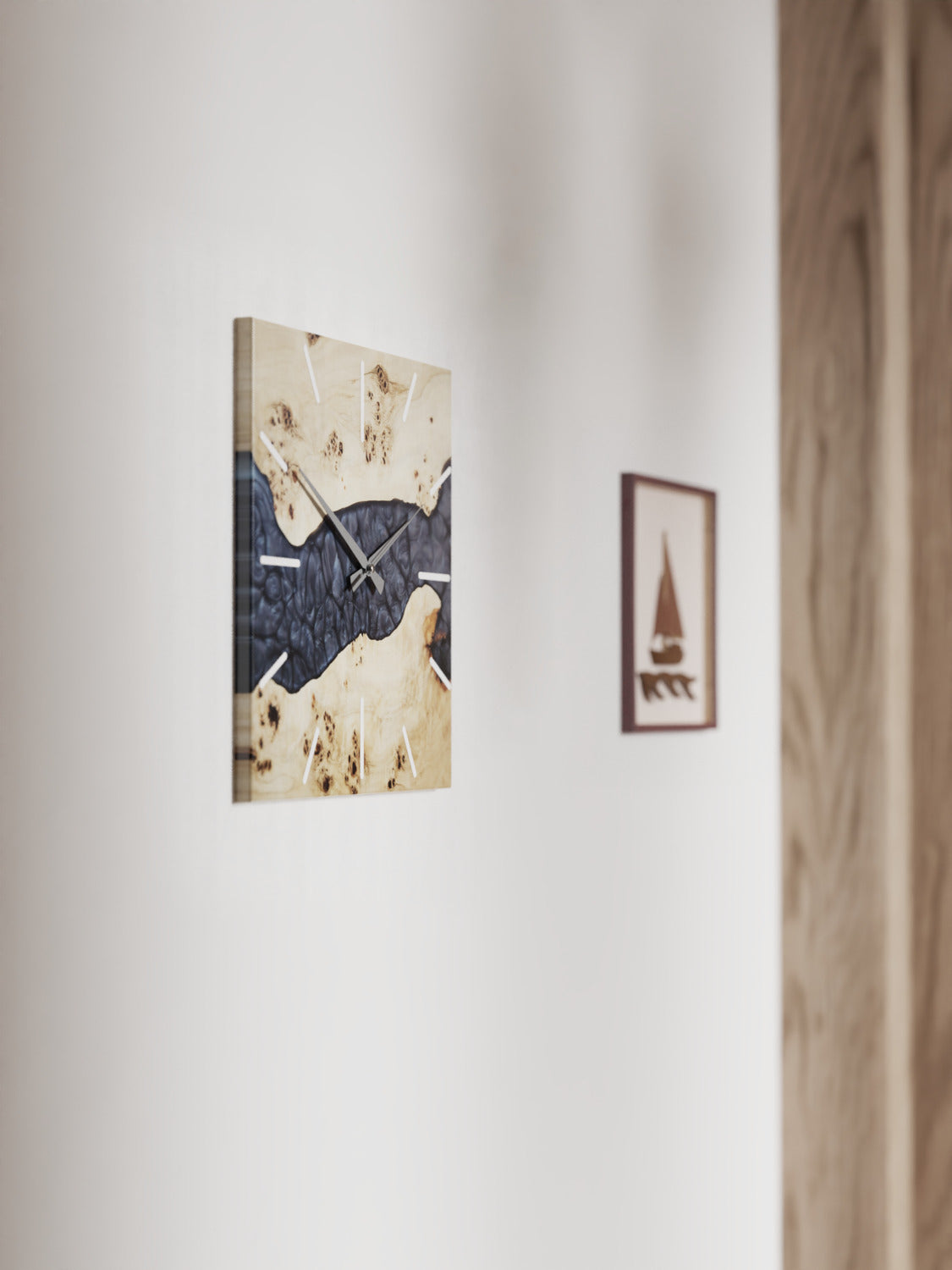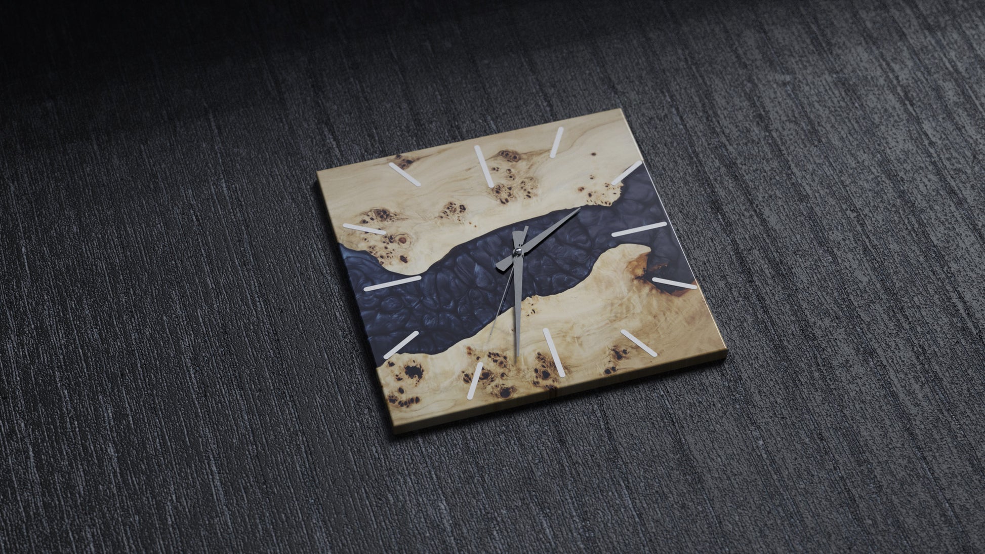 Introducing the captivating Obsidian Resin Wall Clock – an embodiment of sophistication and nature's allure. This square timepiece is a harmonious fusion of premium mappa burl wood and sleek black resin, a celebration of both design and sustainability.