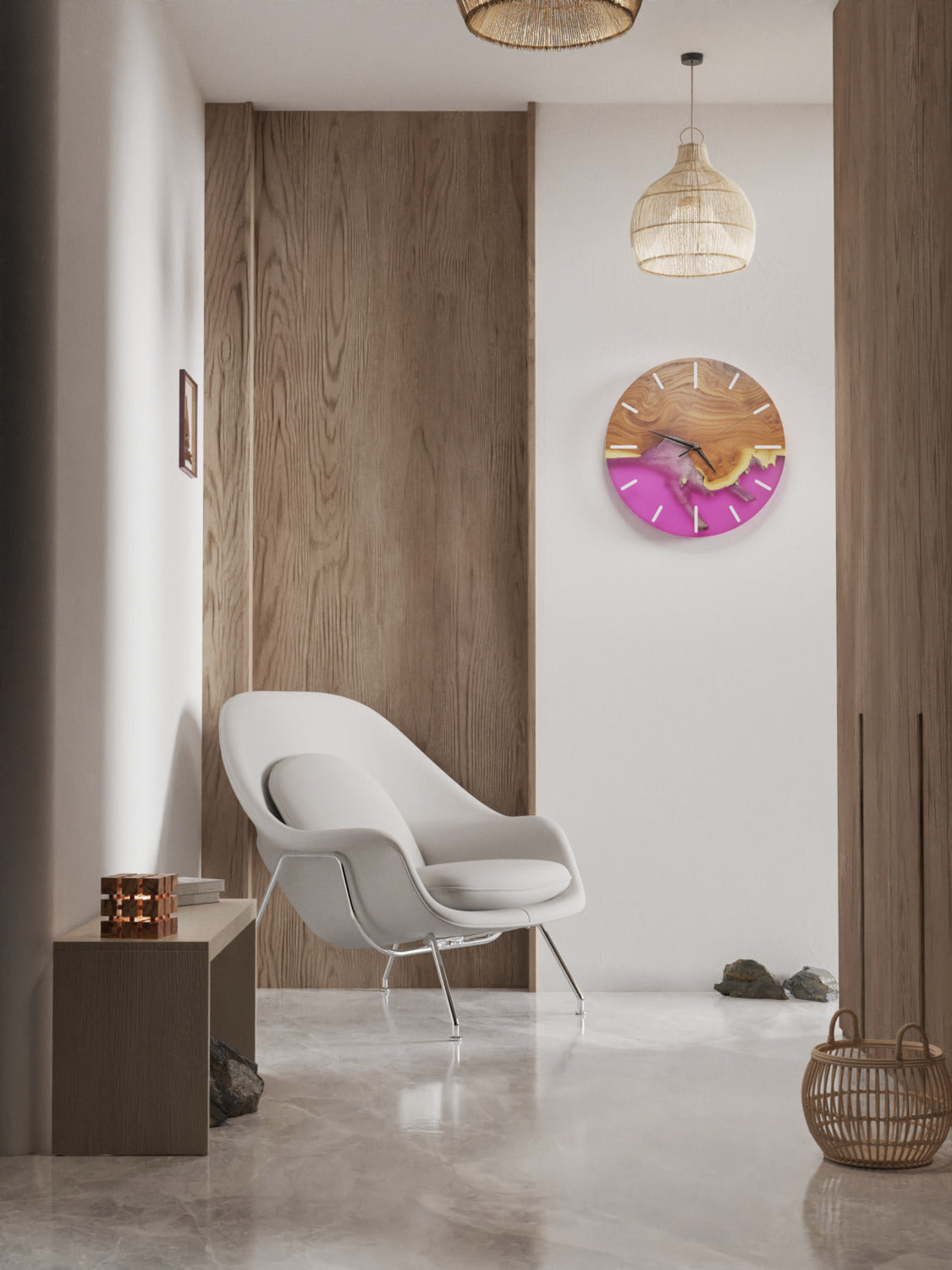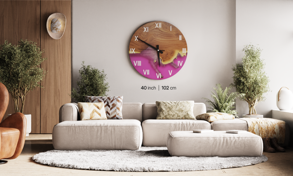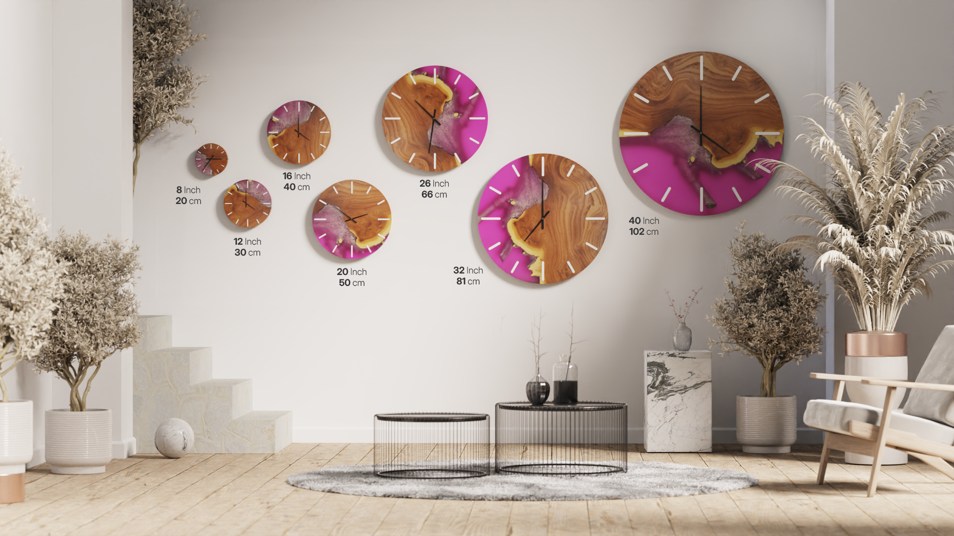 Please note that due to the natural variation of wood, every product can slightly differ from the pictures, adding to its charm and uniqueness. Rest assured that the essence of the Roseate Blush Resin Wall Clock's beauty will be preserved in every piece.