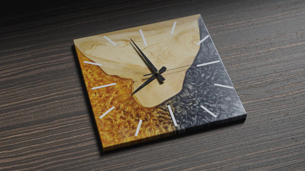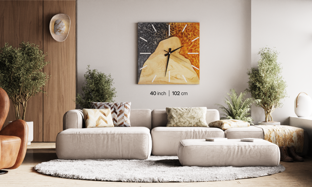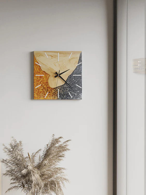 Introducing the Sultan Wall Clock – a regal fusion of premium olive wood and captivating resin, meticulously handcrafted to grace your space with timeless elegance. This square masterpiece embodies the marriage of tradition and innovation, creating a stunning timepiece that's more than just a clock – it's a work of art.