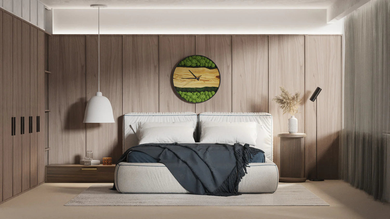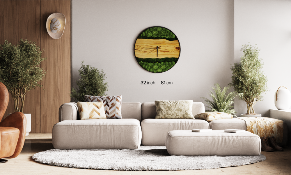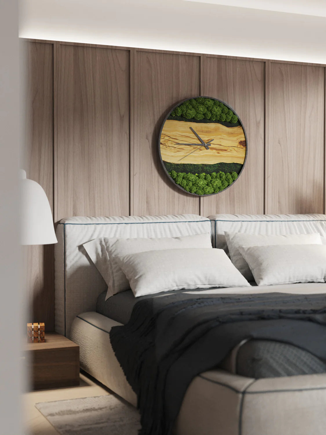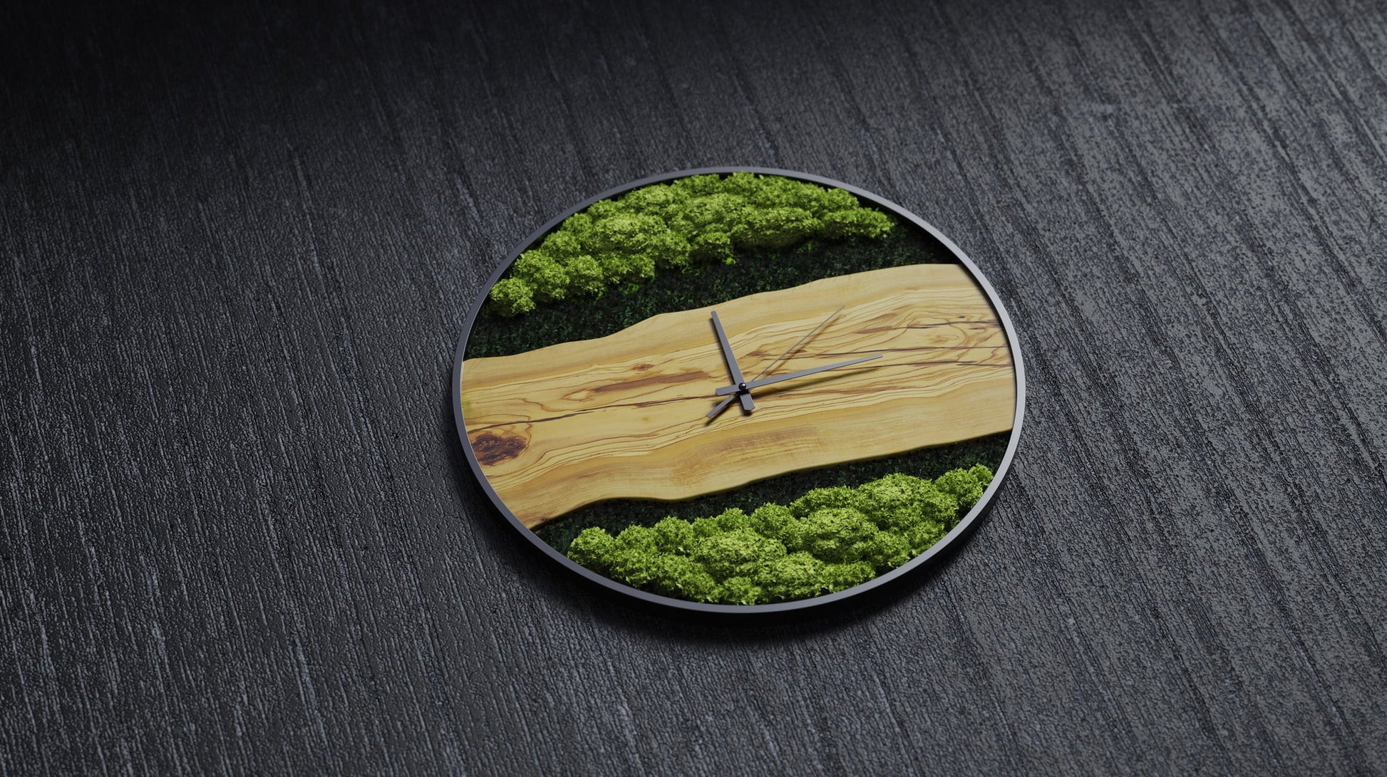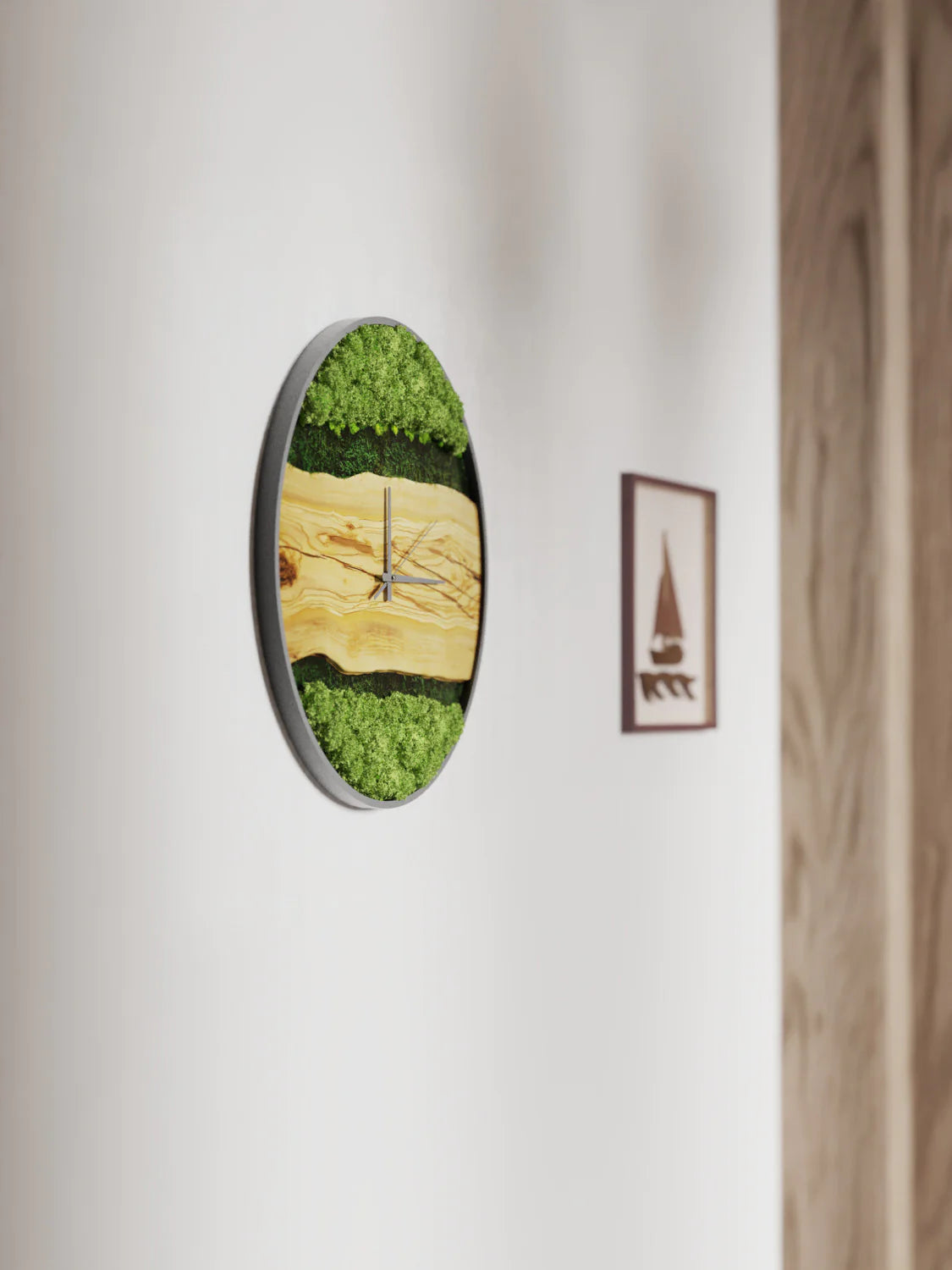 Premium olive wood and preserved moss blend seamlessly, elevating this clock from mere functionality to artistry. Every tick resonates with the harmony of nature and craftsmanship.