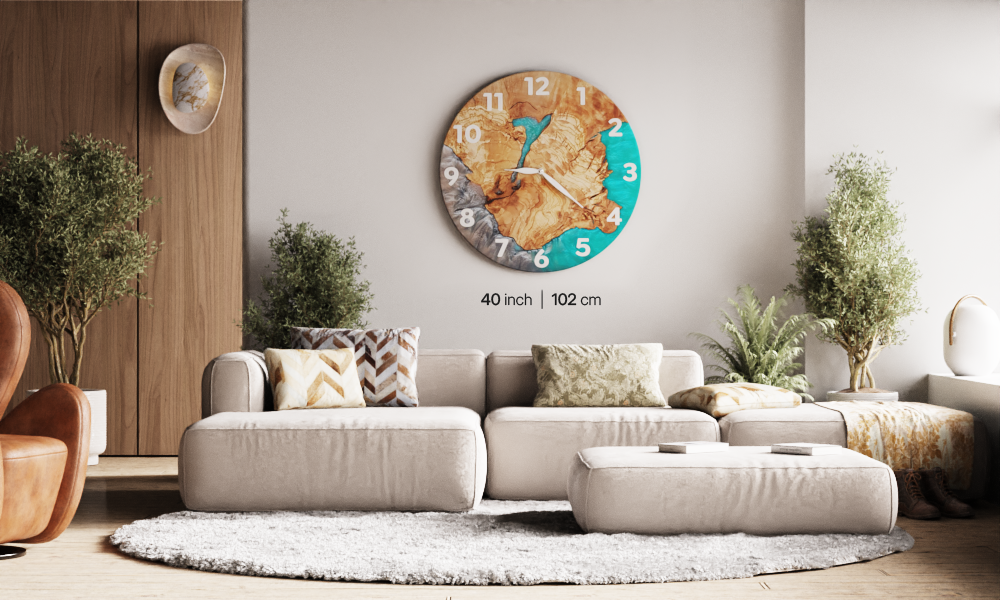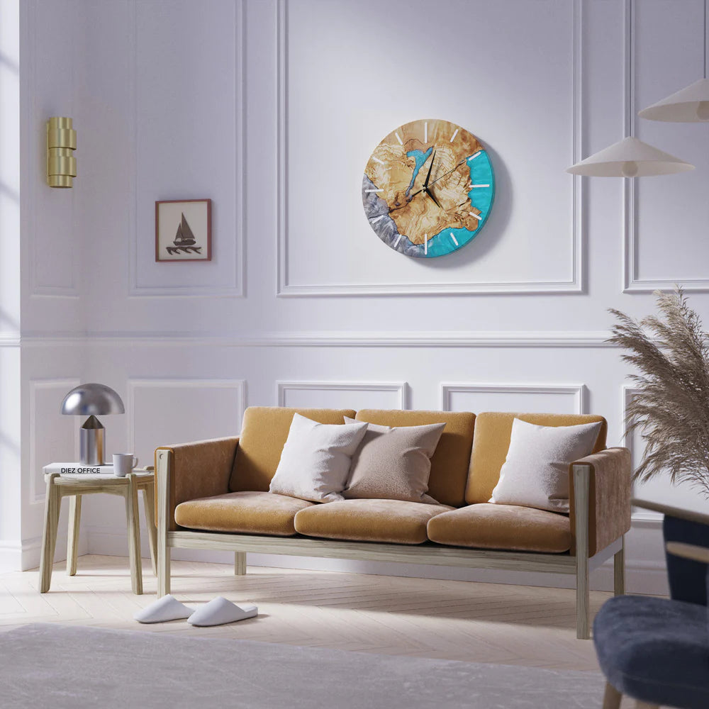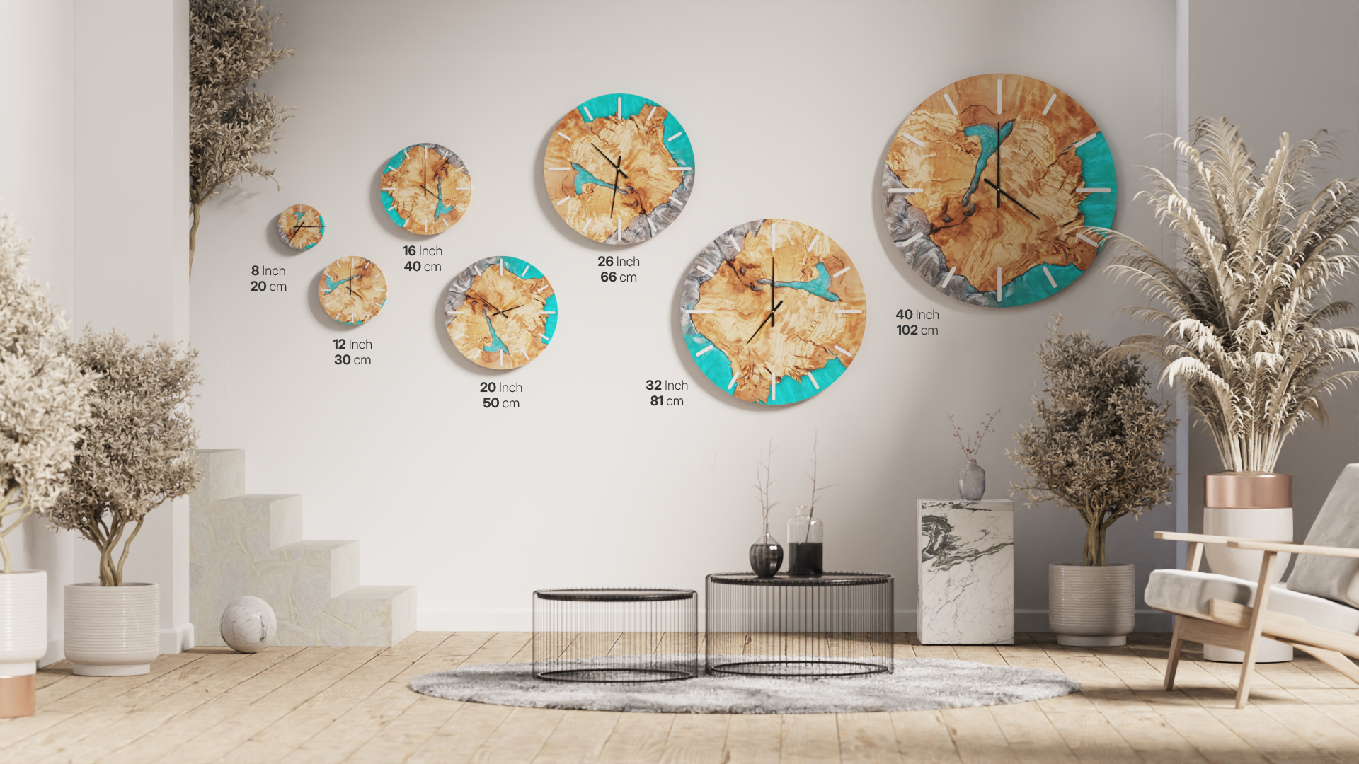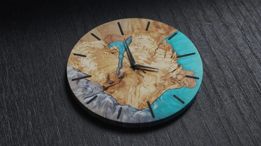 The Teal Harbour Wall Clock transcends traditional timepieces, merging the allure of premium olive wood with the captivating charm of resin. The result is a mesmerizing creation that serves not just as a clock, but as a statement piece that sparks conversation.